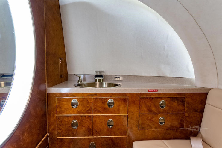 Eight passengers floor plan with 5 Individual Pedestal based Chairs arranged in a Forward Double Club, AFT 3 Place Divan opposite Fwd Facing Chair, Certified Belted Potty,